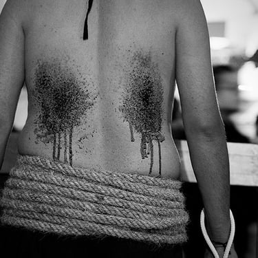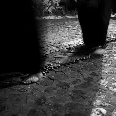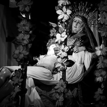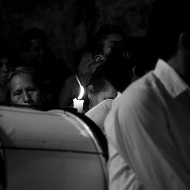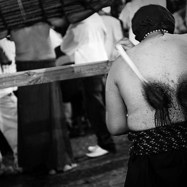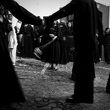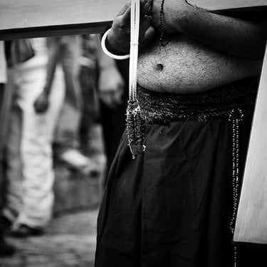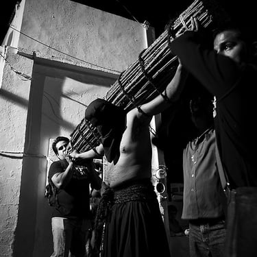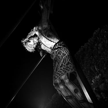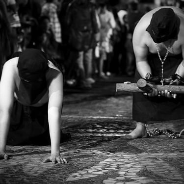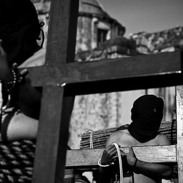 Penitente Encruzado, wrapped in horse hair rope, carries a 40 kilo (90lbs) bundle of barbed 'zarza' canes, during the Thursday night procession. Holy week in Taxco de Alarcon, Mexico. (2011)